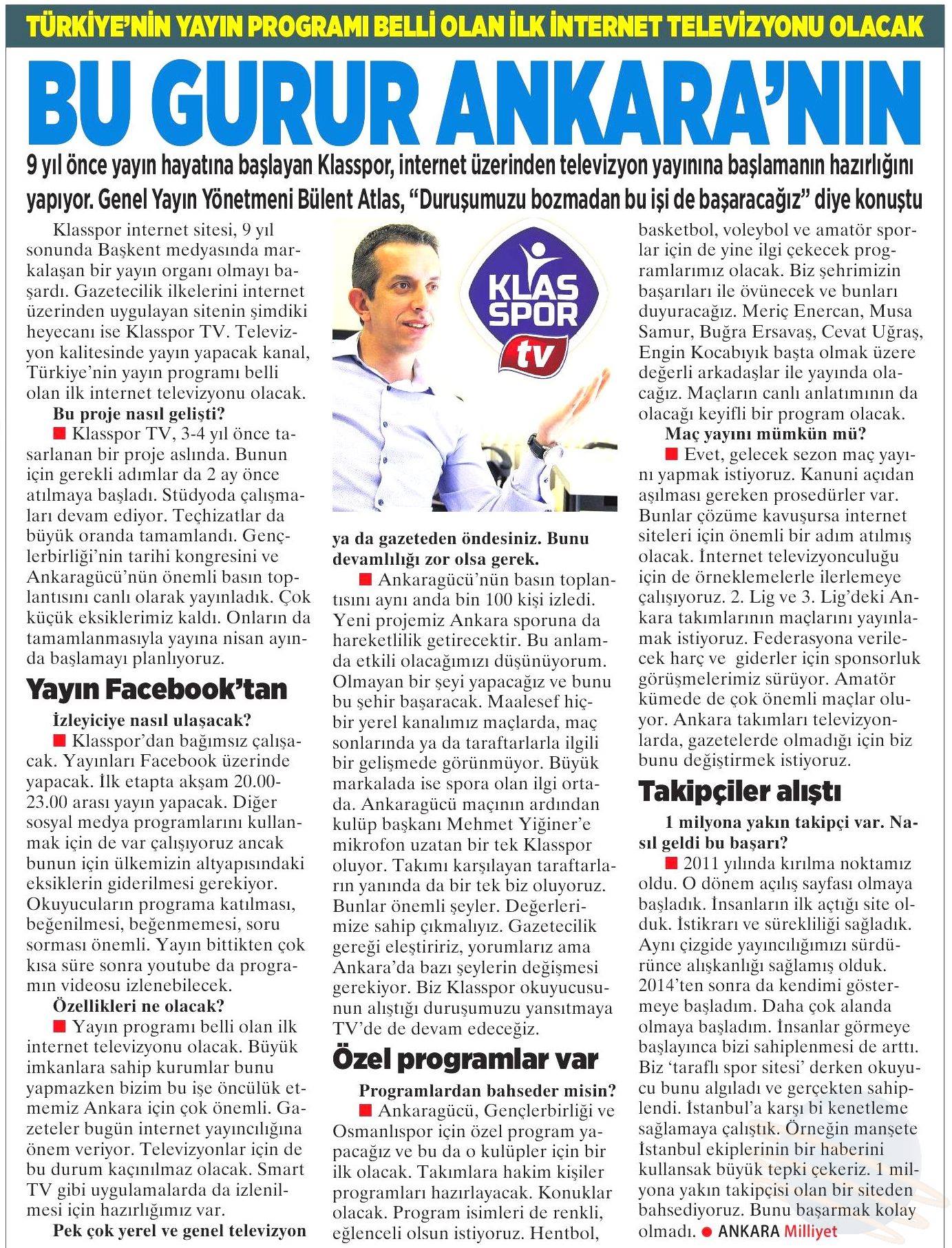 Klasspor internet sitesi, 9 yıl sonunda Başkent medyasında markalaşan bir yayın organı olmayı başardı. Gazetecilik ilkelerini internet üzerinden uygulayan sitenin şimdiki heyecanı ise Klasspor TV. Televizyon kalitesinde yayın yapacak kanal, Türkiye’nin yayın programı belli olan ilk internet spor televizyonu olacak.